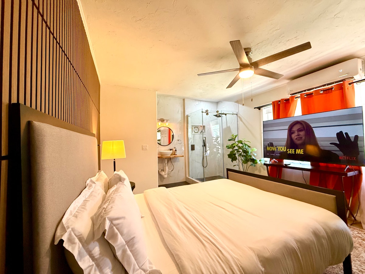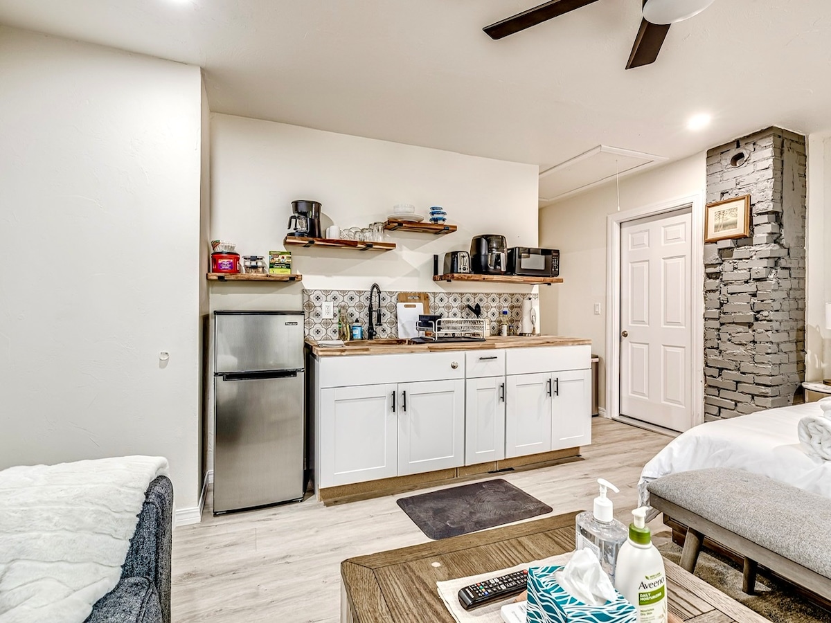 ДИВОВИЖНЕ РОЗТАШУВАННЯ! Чудова пішохідність у чистому, затишному районі. Відстань пішки до UCO, швидкий доступ до I-240 і I-35. Красива, нещодавно відремонтована квартира в гаражі має Smart TV з безкоштовним Netflix, кухню з повним спектром послуг для приготування їжі з усією новою технікою, безкоштовними засобами для прання за запитом, безкоштовною кавою, швидким Wi-Fi - все необхідне для роботи далеко від дому або просто насолоджуватися відпусткою. Наші засоби для прибирання нетоксичні. Приходьте насолоджуватися цим спокійним, приголомшливим відпочинком!