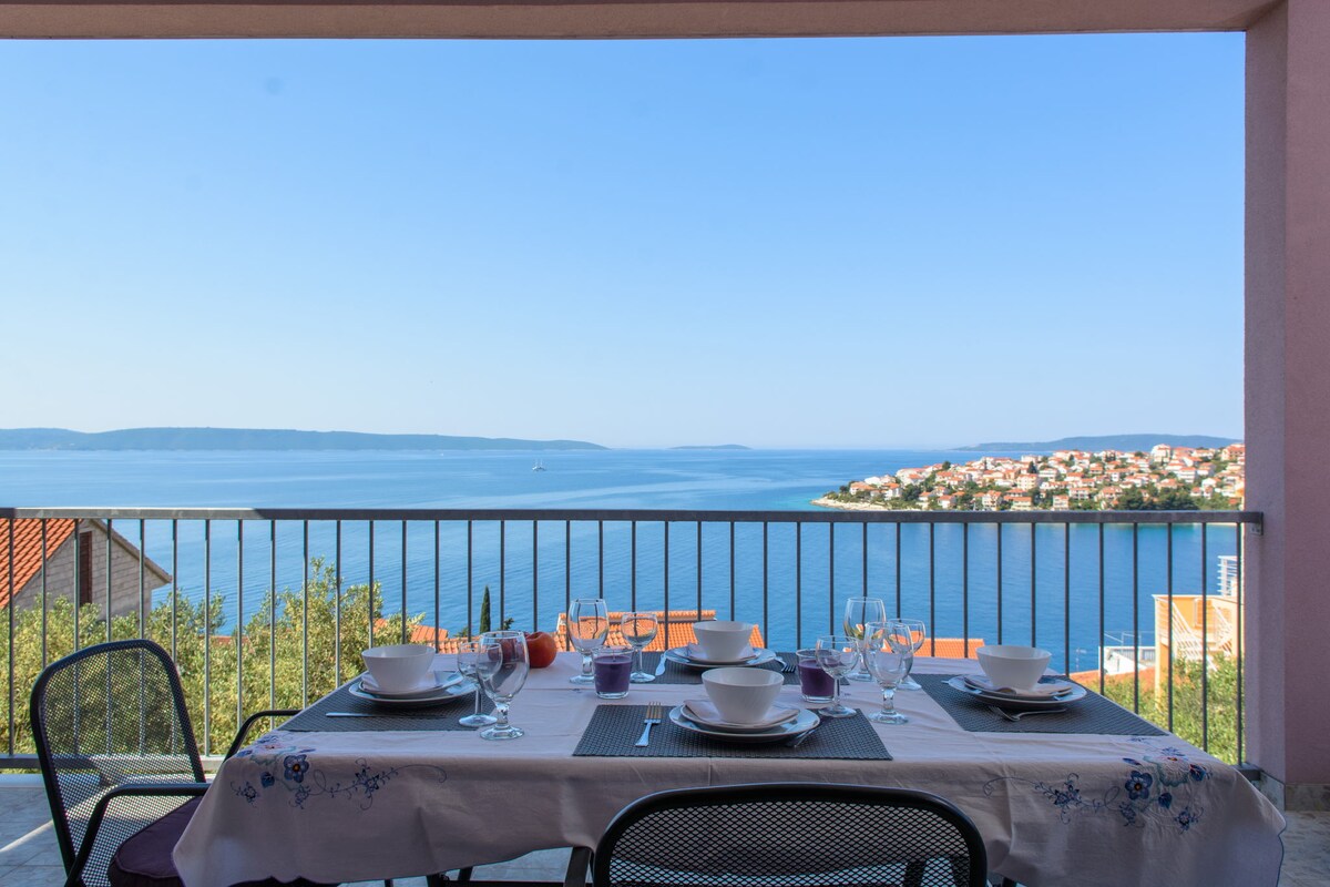 Квартира унікальна завдяки безцінному виду на море та чудовій терасі (20 кв. м), де гості можуть сидіти або засмагати та насолоджуватися оглядом навколишніх островів, таких як Шолта, Брач, Хвар, Дрвенік... Квартира розташована на першому поверсі з окремим входом. Вона складається з двох спалень, ванної кімнати, вітальні з обідньою зоною та кухні. Затишний оформлений, він забезпечує вас інтимною атмосферою.