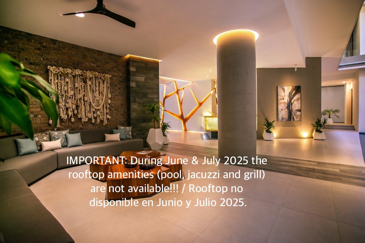 Насолодіться сучасним затишним помешканням у центрі яскравої романтичної зони Пуерто-Вальярти – ідеально підходить для пар, індивідуальних мандрівників або невеликих груп (до 4 гостей; додаткова плата за кожного наступного гостя). Прогуляйтеся до пляжів, ресторанів, нічних клубів, клубів та місцевих пам’яток. Ідеально підходить для відпочинку або тривалого перебування, з усім необхідним, щоб почуватися як удома. ВАЖЛИВО: зручності на даху (басейн, джакузі та гриль) будуть тимчасово недоступні протягом червня-липня 2025 року.