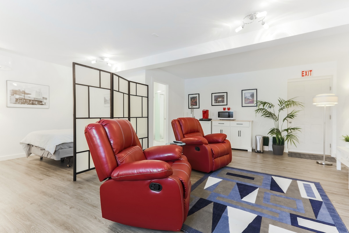 ліцензія445550101 002 Безпечний для астми /алергії Приватний гостьовий лофт, розташований там, де зазвичай розташований гараж і виходить на провулок 1 двоспальний номер 2 гостя Система опалення, вентиляції та кондиціонування відокремлена, без потоку повітря, спільна з верхнім лофтом Фільтрована вода - не потрібно купувати бутильовану воду! Навіть вода для душу фільтрується! Доступно для людей на інвалідних візках шкіряні качалки Високошвидкісний Wi-Fi. 55-дюймовий смарт-телевізор Мікрохвильова піч, кава Keureg, невеликий холодильник