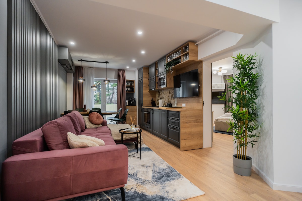 Завітайте в цю яскраву, сучасну студію, створену для стилю та комфорту. Ідеально підходить для трьох гостей, має затишну спальну зону, повністю обладнану кухню, спеціальний робочий простір, паркувальну систему Klaus (максимальна висота автомобіля: 1,5 м) і зручну вітальню зі смарт-телевізором. Насолоджуйтеся м’якими природними тонами, дерев’яними деталями та шикарним плануванням – і все це в тихому, але центральному районі. Ідеальна база для роботи або відпочинку в Бухаресті.