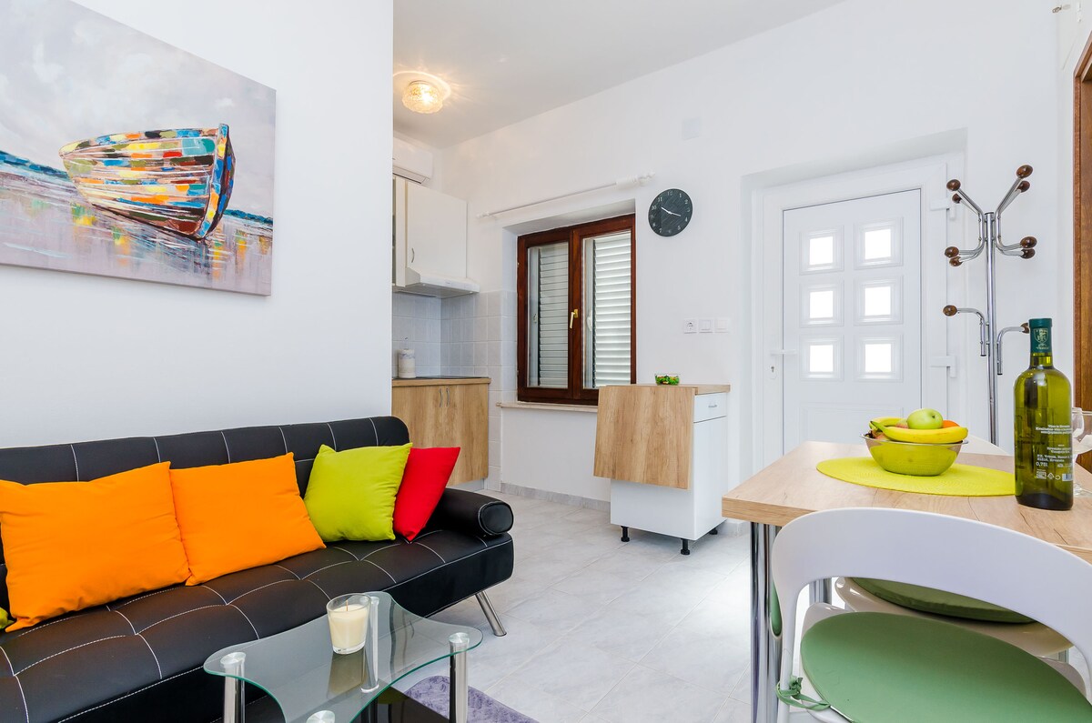 Квартира добре розташована, в 15 хвилинах ходьби від Старого міста, в оточенні скелястих пляжів менше ніж за сотню метрів, а галечний - близько 200 м. Невелика тераса в тіні оливкового дерева та перголи, квітковий сад, спокійна територія ... Що стосується дуже маленької окремої кімнати, квартира ідеально підходить для двох дорослих або сім 'ї з двома дітьми або молодими людьми, які не проти спати на двоярусному ліжку .