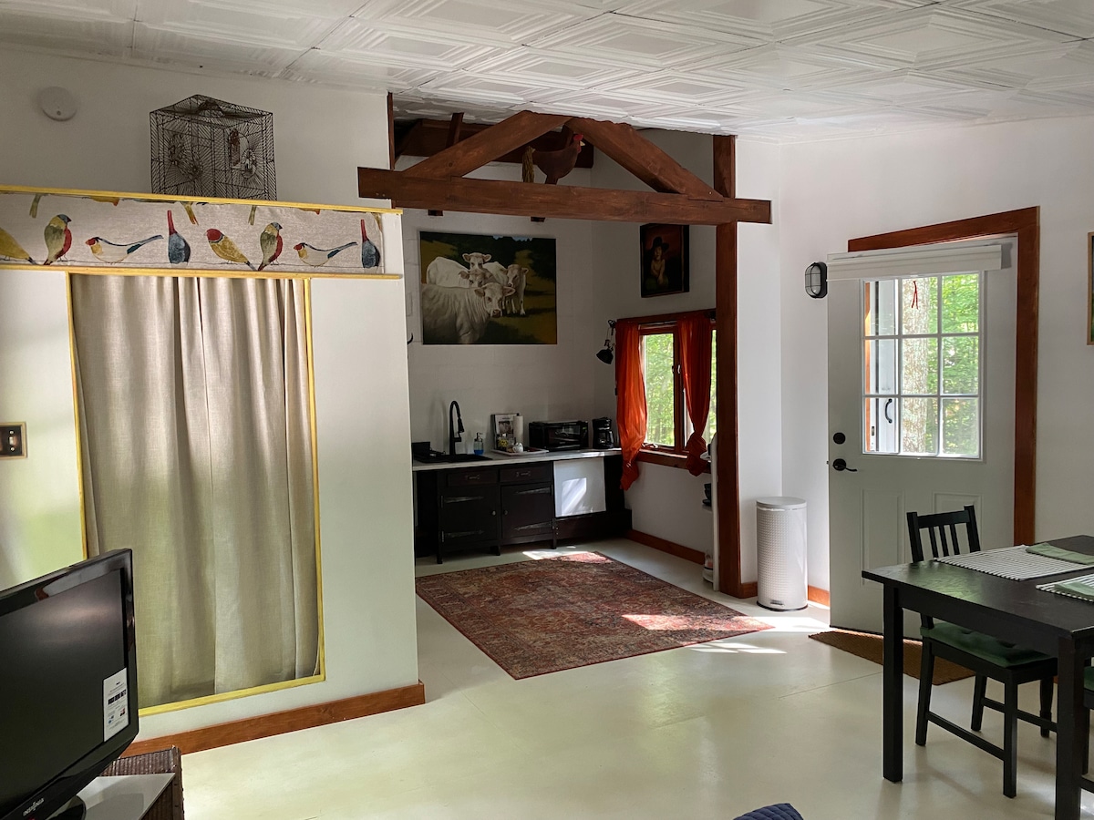 Гостьові апартаменти в помешканні давнього художника та мешканця Вудстока. Окремий вхід з палуби 2-го поверху з видом на луг і гори. У просторі є все необхідне для відпочинку від усього цього – куточок для медитації на 2, килимки для йоги, які можна використовувати всередині або зовні на палубі, гідромасажна ванна, щоб відпочити і розслабитися після дня в красивих горах Катскілл. Гідромасажна ванна знаходиться на задньому дворі площею 3 акра з усамітненням, тому купальні костюми є необов 'язковими (ми надаємо халати).