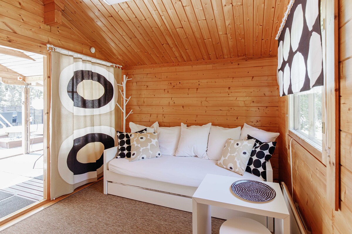 Невеликий бабусиний заміський будиночок на краю лісу, у спокійній сільській місцевості. Розташування приблизно в 10 км від центру Лапуа. Котедж має власний двір, і можна перебувати з домашніми тваринами. У котеджі є одна спальня з двома ліжками, а на кухні є одне ліжко. Туалет у приміщенні з душем у тій самій кімнаті та коридор. У спальні є повітряний тепловий насос. Невелика дров’яна сауна, розташована у дворі котеджу, була відреставрована навесні 2024 року. Дрова для опалення сауни включені в вартість перебування.