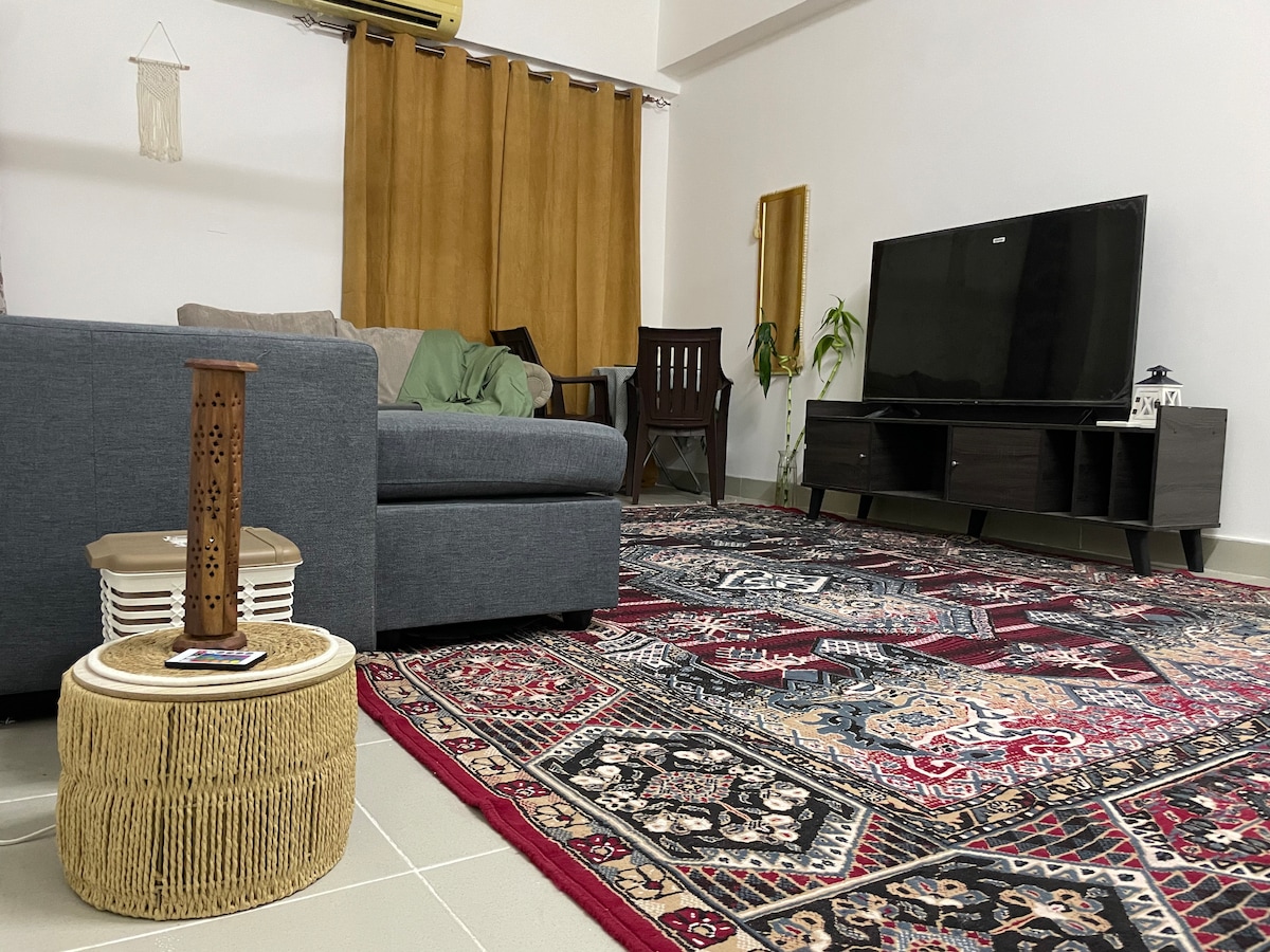 Сучасна, затишна квартира в центрі Маската — недалеко від головних пам’яток і зручного доступу до міста. До послуг гостей телевізор Smart TV, високошвидкісний Wi-Fi, повністю обладнана кухня та зручні меблі. Ідеально підходить для мандрівників, які шукають комфорт і зручність у центрі Маската. У будівлі є басейн на даху, приватний кінотеатр, а також цілодобова охорона та приватна парковка на території. Найближчий супермаркет знаходиться за 7 хвилин ходьби, а пляж — за 1,2 км.