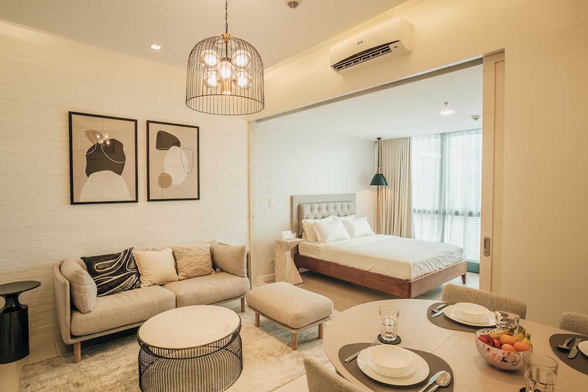 З любов’ю та ретельністю оформлене помешкання в теплій скандинавсько-індустріальній тематиці розташоване в One Uptown Residence – навпроти торгового центру Uptown Mall (з 5 кінотеатрами, супермаркетом, фуд-кортом, ресторанами, магазинами), з яким його з’єднує підземний прохід. Поруч розташовані такі клуби, як Xylo (колишній Valkyrie), The Island (колишній Palace Pool Club) та Grand Hyatt Hotel. Наші гості також матимуть доступ до басейну на 6-му поверсі.