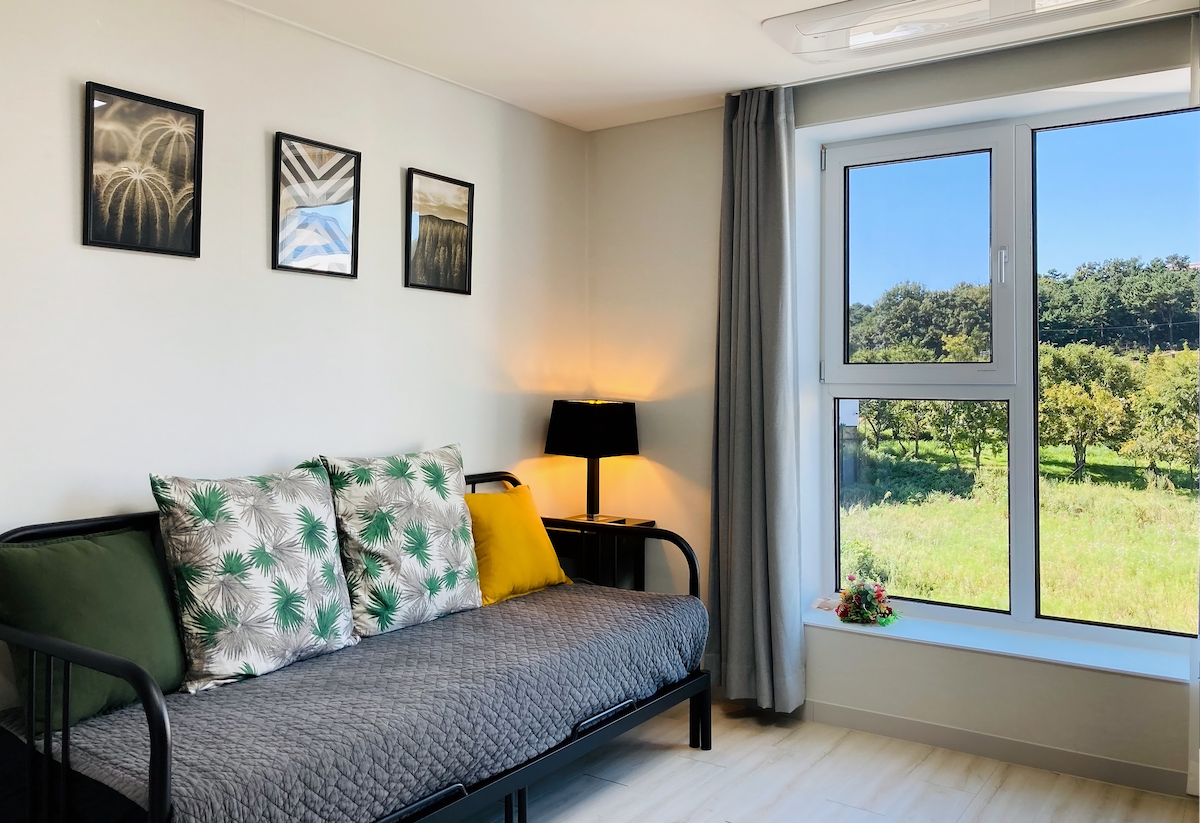 Це багатоповерхове помешкання преміум-класу розташоване за 10 хвилин пішки від станції Унсео та за 10 хвилин їзди від аеропорту Інчхон та арени Inspire. Елегантне освітлення, мінімалістичний інтер’єр і зелений краєвид за вікном забезпечують спокійне зцілення. 🌿 На першому поверсі розташовані розкішна вітальня та кухня На другому поверсі є затишна спальня. Кожна кімната повністю обладнана постільною білизною в готельному стилі, індивідуальним телевізором, шафою, опаленням та кондиціонером. Безкоштовна парковка, самостійна реєстрація заїзду, пральня, мікрохвильова піч і базові кухонні приналежності – ідеально підходить як для тривалого, так і для короткострокового перебування. Усі меблі та постільні речі нові, і ви можете почуватися комфортніше, ніж у готелі, у тихому та чистому середовищі. Щоб зробити ваш день максимально спокійним і гідним Це особливе помешкання. 🕯️✨ ⸻ • Ексклюзивне використання всього 2-го та 3-го поверхів • 2 пральні машини + 1 сушильна машина • Телевізор у кожній кімнаті • Повністю обладнана кухня. • Індивідуальне опалення та охолодження у всіх кімнатах • Автобусна зупинка перед помешканням • Магазин: 30 секунд пішки, розташований на вулиці з ресторанами та кафе