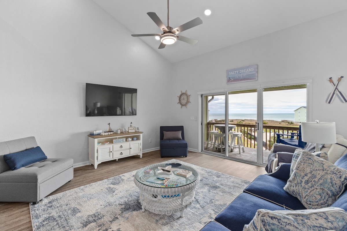 Relax with the whole family at this cozy OCEANFRONT condo on peaceful North Topsail island. Wake up to the sound of crashing waves and enjoy your coffee on the balcony while the sun rises and the dolphins play. With enough beds to sleep 5 and a full kitchen, this is the perfect place to make home base for your North Carolina beach vacation. *shoreline changes constantly- tides schedule available *NC coast is humid-dehumidifiers in unit *perfect couples retreat