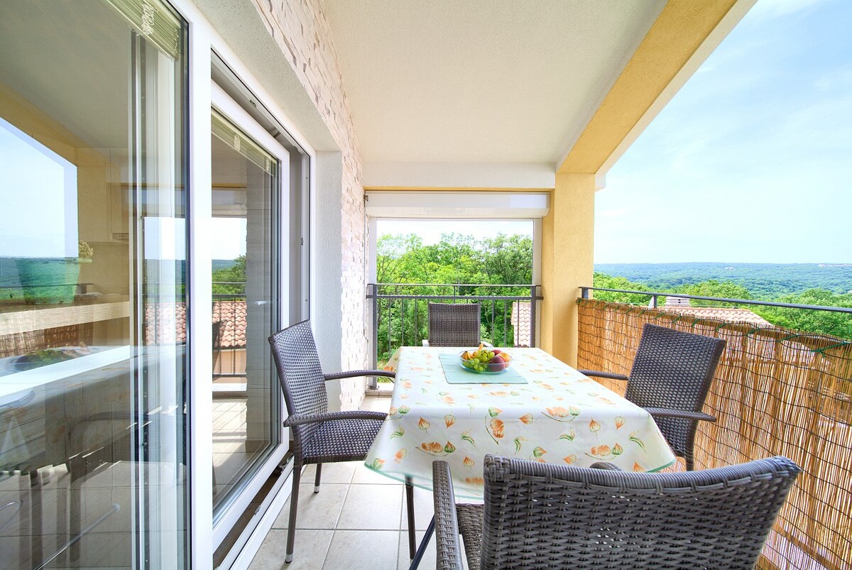 Das modern und gemütlich eingerichtete Apartment liegt im Dachgeschoss des Hauses und bietet Platz und Komfort für 2 bis 3 Personen. Im Apartment finden Sie ein Esszimmer mit gut ausgestatteter Küche, ein Schlafzimmer mit einem Doppel- und einem Einzelbett, ein Badezimmer mit Dusche und WC. Das Apartment bietet zudem einen Balkon mit Bestuhlung und schönem Meerblick. Im Außenbereich erwartet Sie die gemeinsame Terrasse mit Liegen, Grill und mit wunderschönem Swimmingpool.