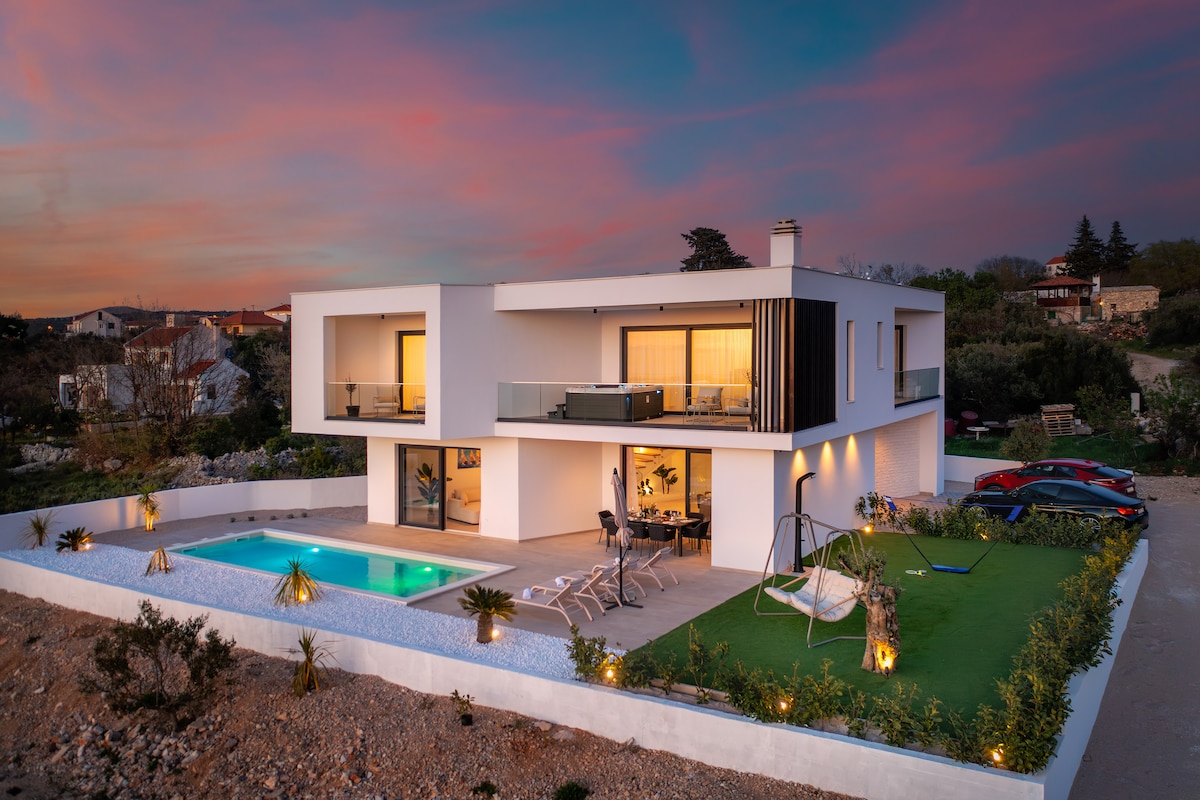 Прокиньтеся з панорамним видом на Адріатичне море в тихому помешканні над Примоштеном. Кожна кімната виходить на море, а чотири спальні нагорі виходять на широку приватну терасу для повільного ранку на відкритому повітрі. Басейн із солоною водою, оточений природою, ідеально підходить для спокійного купання, а вітальня відкритого плану легко переходить у сад. Насолоджуйтеся їжею на критій відкритій кухні або відпочивайте в затіненому лаунжі – спокійному місці для сім’ї або друзів, лише за декілька хвилин їзди від узбережжя.