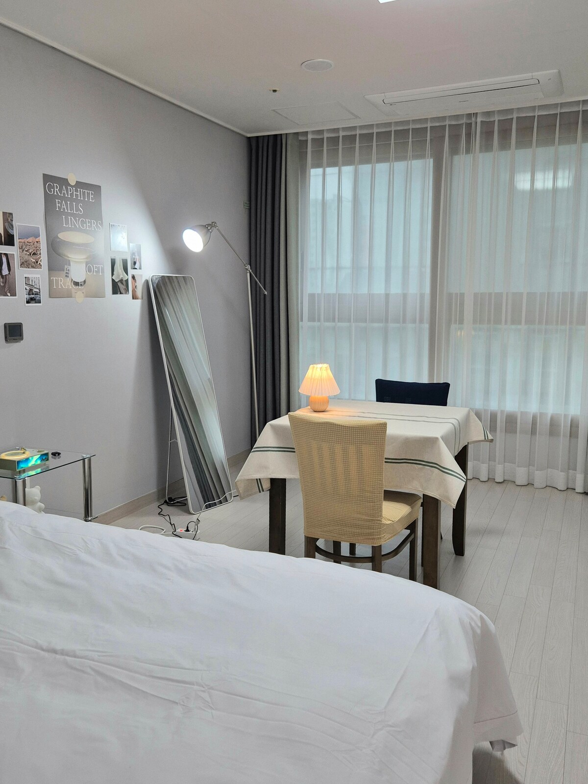 Будівля розташована приблизно в 10 хвилинах їзди на автомобілі від аеропорту. Сам район тихий, а звук спів птахів, кузнечик звучить як пісня, і я почуваюся ласкаво. Тут немає різних зручностей, але поблизу є ресторани, чайні будинки, бібліотеки, художні центри та храм Вольчжонса.Тут є долина воріт кімнати, і якщо ви пересуваєтеся на автомобілі, це не Хён.Зручності доступні протягом 10 хвилин. Це також зручне місце для переїзду до Согвіпо. Для безпеки мандрівників-жінок з точки зору з донькою ми встановили захисний захисний гачок із подвійним замком, який не ламається навіть для відеоспостереження та зовнішніх впливів.