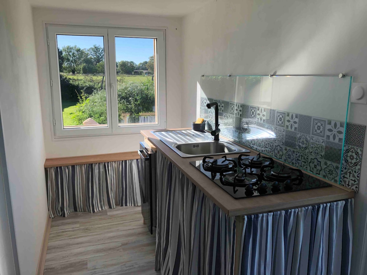 Помешкання складається з двох окремих 5-метрових частин один від одного; окреме шале зі спальнею площею 16 м2, обладнане двоспальним ліжком і піднятим односпальним ліжком, з одного боку, і будівля площею 17 м2, що примикає до нашого будинку, де є ванна кімната та окрема кухня/обідня зона. Це окреме помешкання цілком.