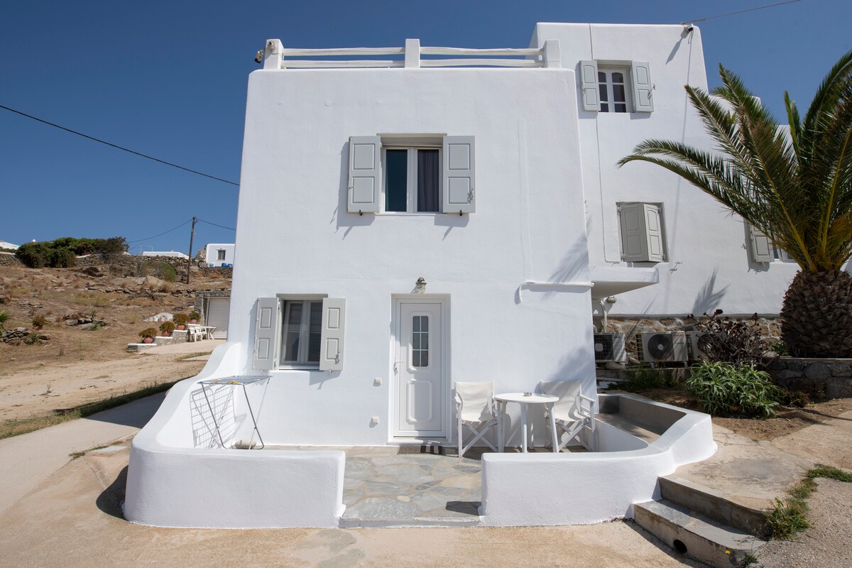 Розташоване в центрі міста Міконос, поруч із вітряками. Повністю відремонтовано з високою естетикою для незабутнього перебування! Коли ви входите, є простора вітальня з традиційним відреставрованим диваном та одним диваном на односпальному ліжку, повністю обладнаною кухнею ,ванною кімнатою та однією спальнею з двоспальним ліжком. другий поверх: є дві спальні, одна з яких знаходиться в лофті з двома односпальними ліжками (стає одним двоспальним ліжком King size),однією двоспальною спальнею та однією ванною кімнатою. Насолоджуйтеся прекрасним дахом !