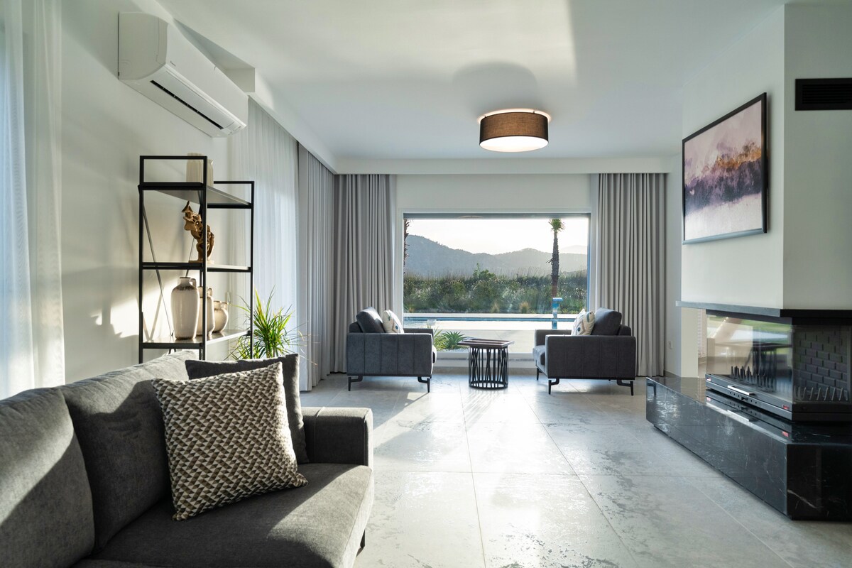 Villa Altun 1 is planned according a private luxury villa standards, in a quiet location and within the green agricultural land apart from the dense structures in Dalyan. The most important feature is that it provides easy of use to the guests as it is a single floor There are 2 separate lux villas with 250 m2 single structure and high ceilings in a 2000 m2 land and each villa is in a separate position with a 1000 m2 detached garden and pool..There is a stone barbeque at the side of the villa.