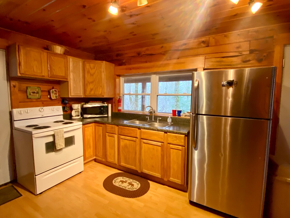Welcome to the Hideaway Cabin, where you can unwind in the embrace of nature. Here, you can sizzle your favorites on the grill, lounge in the Adirondack chairs on the balcony, or simply relax indoors. Come evening, gather by the firepit on the porch to watch the fireflies dance or relax in the hot tub on the back porch. It's the ideal blend of natural serenity and homely comfort. In the winter, cozy up by the woodstove in the living room and catch up on your favorite TV shows.