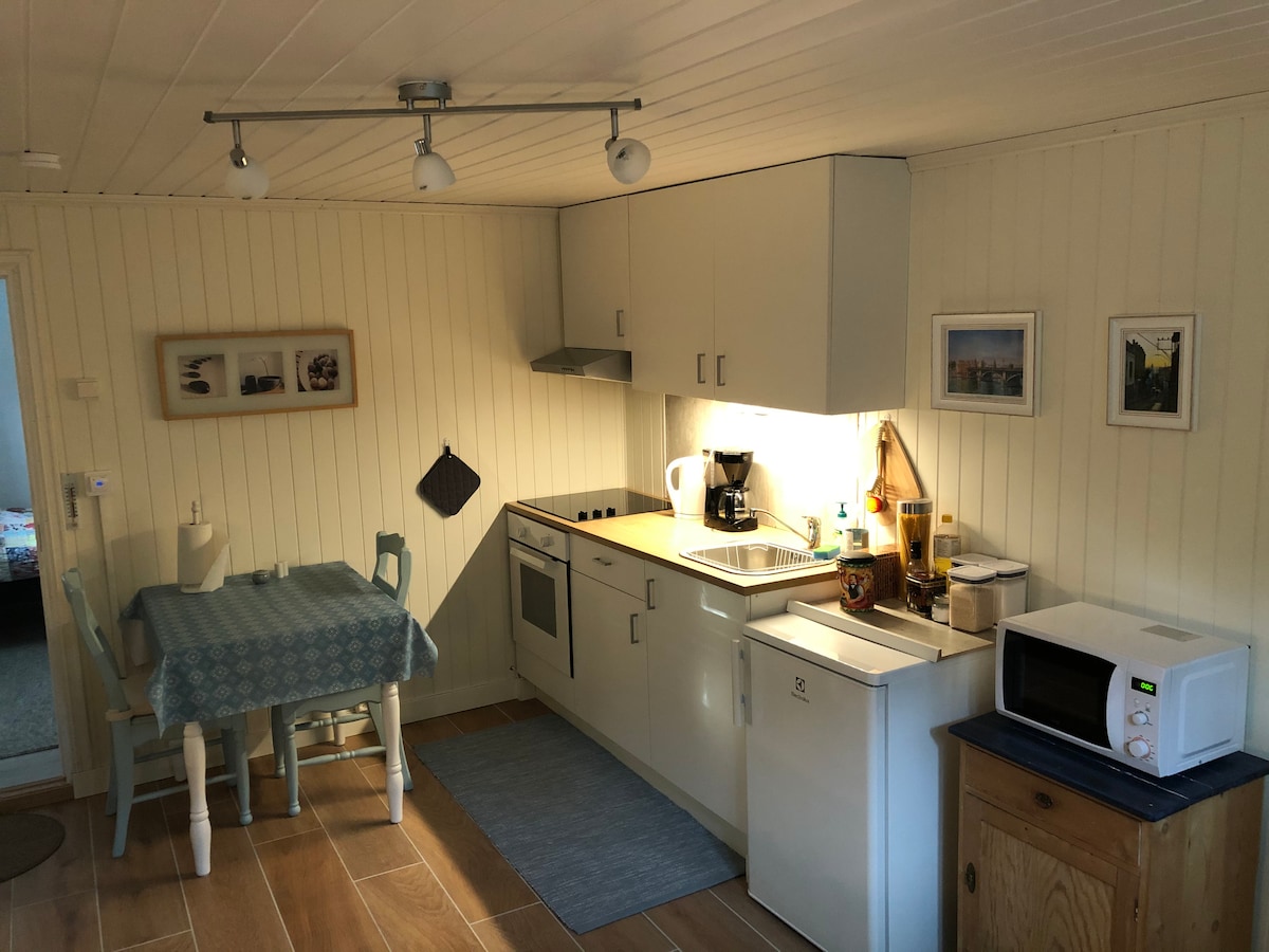 Квартира на цокольному поверсі в гранітному кам 'яному будинку 1953 року. Гарна атмосфера. Всього в 20 хвилинах ходьби від залізничного та автобусного вокзалів. Окремий вхід. Нова ванна кімната та невелика кухня. Інтернет та телевізор. Будинок розташований в тихому оточенні, і є багато можливостей для піших прогулянок лісами та купання в морі. Центр міста Фредрікстад і коледж знаходяться всього в 20 хвилинах ходьби. У 5 хвилинах від безкоштовного порома, який доставить вас до старого міста або центру міста. Я хочу, щоб усі гості почувалися як удома. Ванна кімната у ванні за домовленістю.