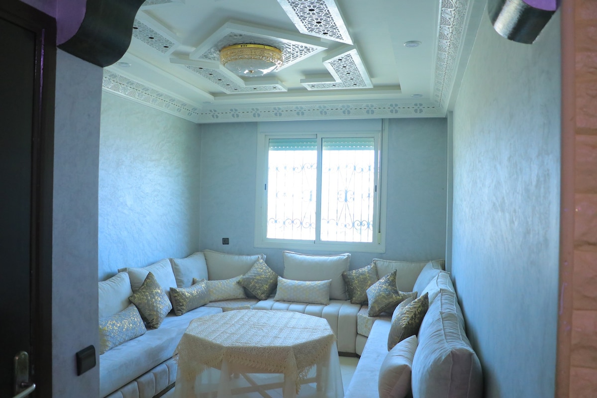 Modern, bright apartment on the 4th floor of a well-maintained residential building on Avenue des Facultés in El Jadida opposite side of the cafe olé. Quiet and safe location, just a few minutes from the beach, old town, and university. The apartment offers one bedroom with a balcony, two living rooms , a kitchen, a bathroom, TV with IPTV and Wi-Fi. Ideal for couples, travelers, or longer stays – central, comfortable, and well equipped.
