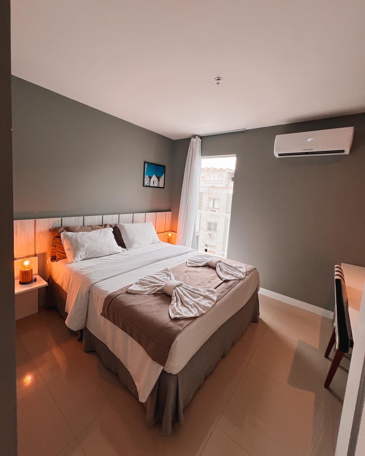 tudo novo! cofre,espelhos,roupas de cama de alto padrão ,finamente decorada acomoda casal ou 2 solteiros e tem uma cama auxiliar. as dependências do hotel são ótimas com restaurante, bar,piscina, sauna academia e agora com estacionamento grátis a disposição. colocamos na TV um cabo HDMI conectado para seu notebook ou streaming ,no frigobartem bebidas que pode ser pagas no QR code e o mesmo para o cafe expresso!.. estacionamento grátis dentro do hotel. faremos de tudo para sua estadia ser top!