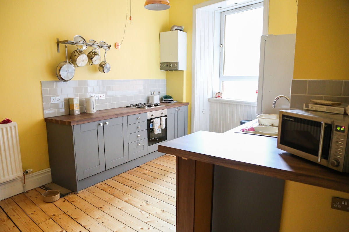 Нещодавно відремонтована традиційна квартира на першому поверсі, розташована на головній дорозі в центрі Пейслі, поруч з усіма зручностями, такими як магазини, парки, бари та туристичні об 'єкти. Є 2 місцеві залізничні станції, які йдуть до Глазго, Канал-стріт знаходиться в 2 хвилинах ходьби, а вулиця Гілмор - всього в 10 хвилинах ходьби, а аеропорт Глазго також знаходиться всього в 10 хвилинах їзди, залежно від дорожнього руху. Квартира може зручно розмістити 4 осіб і підходить для ділових поїздок, пар, сімей та соло-мандрівників.