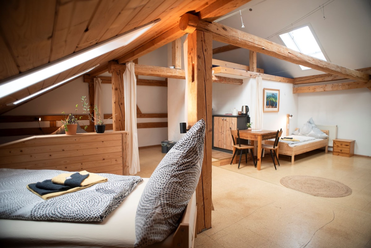 Ласкаво просимо в нашому затишному лофті в центрі Алджяу! Насолоджуйтеся кожним сезоном посеред цього приголомшливого регіону, всього в 5 хвилинах від виходу з шосе. Відпочиньте біля каміна, насолоджуйтеся нашою унікальною концепцією освітлення та приготуйте їжу на повністю обладнаній кухні. Тут є невеликий сад і балкон. До послуг гостей безкоштовний паркінг. Відкрийте для себе пішохідні стежки, озера та велосипедні маршрути. Відчуйте незабутні моменти в Альгау!