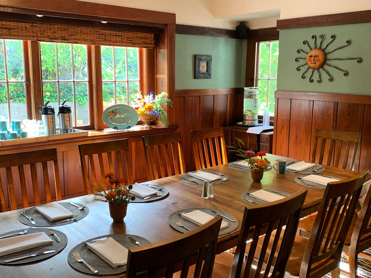 Приходьте, гостюйте у нас і відпочивайте! Послухайте, як вам співають птахи, спостерігайте за колібрі та ДИХАЙТЕ! Вийдіть за двері, прогуляйтеся нашим районом і побачте старі секвої. Нехай ваші турботи відійдуть із келихом вина біля вогнища.(Застосовуються обмеження щодо пожеж) Пориньте у гідромасажну ванну, а потім загорніть у спа- халати. Відчуваєте себе авантюристом? Вирушайте в похід до парку штату Нісен-Маркс. ЗБІР ЗА РАННЮ РЕЄСТРАЦІЮ В РОЗМІРІ 45 ДОЛАРІВ США СТЯГУЄТЬСЯ автоматично за прибуття до 16:00.