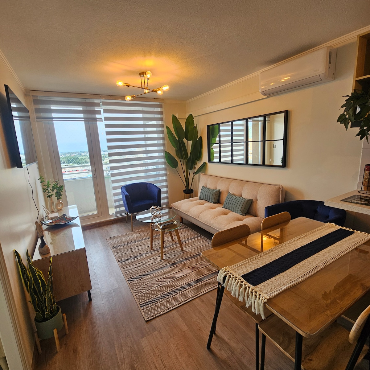 ¡Depto premium 9° piso c/ terraza Centro Temuco! Andrés Bello 255 – 8 min Hospital, unis, clínicas, supermercados. Vista panorámica. Máx 3 personas: cama 2 plazas + sofá cama. Espacio: • Living Smart TV + sofá cama • Dormitorio: cama 2 plazas, sábanas/toallas premium • Cocina: horno, microondas • Baño c/ ducha • WiFi + estacionamiento propio Edificio: Lavadora/secadora, gym, sala reuniones. Check-in conserjería. Limpieza pro. ¡Reserva ya! ⭐