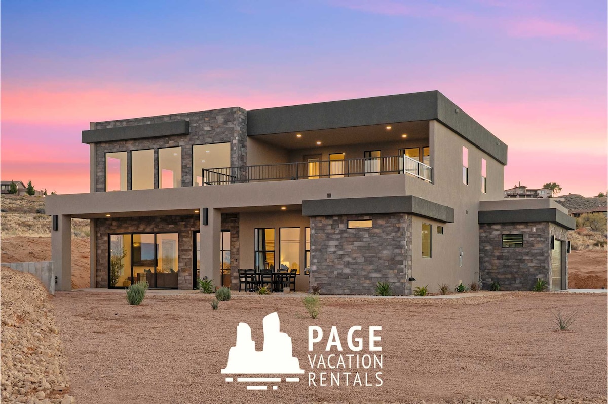 Цей НОВИЙ будинок з 4 спальнями та 2,5 ванними кімнатами вміщує 13 людей і створений як для пригод, так і для відпочинку! Насолоджуйтеся панорамним краєвидом на озеро Пауелл і пустелю з тераси на даху або під час відпочинку в приватній гідромасажній ванні. Завдяки ігровій кімнаті, просторій кухні та великій кількості місць для сидіння це помешкання ідеально підійде для сімей або друзів. Ідеальна база для дослідження Каньйону Антилоп, Хорсшу-Бенд та озера Пауелл – забронюйте своє перебування сьогодні!