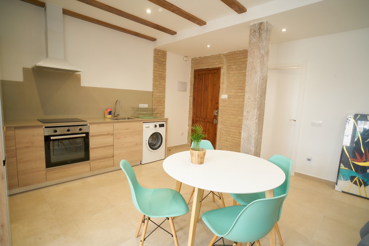 Вітаємо з нашою абсолютно новою, просторою та сучасною квартирою, розташованою в динамічному, яскравому та мультикультурному районі Рузафа в Валенсії. Розташований перед Центральним парком, який є приголомшливим міським парком, ідеально підходить для бігу, їзди на велосипеді та відпочинку, забезпечуючи зелений оазис в центрі міста. Квартира вміщує до 4 осіб. До послуг гостей повністю обладнана кухня, двоспальне ліжко , диван-ліжко та високошвидкісний Wi-Fi. Спроектовано, щоб надати вам всі домашні зручності.