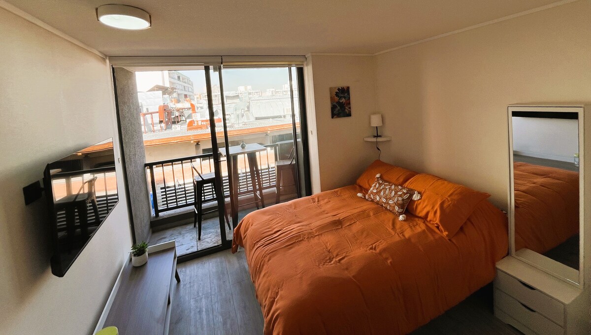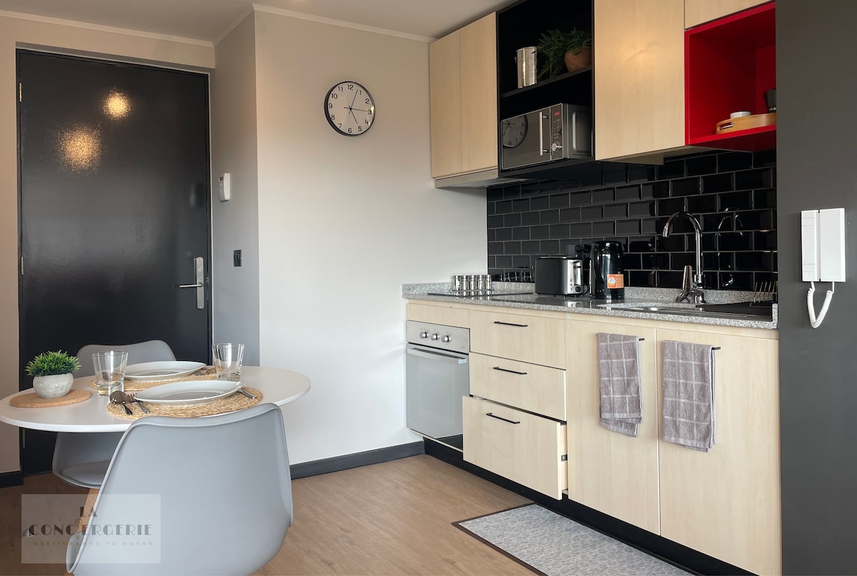 Насолоджуйтеся цією домашньою студією поруч із Movistar та з можливістю підключення в центрі міста. Функціональний простір: спальня, ванна кімната (рушники для душу), обладнана кухня/робоча зона/WIFI, смарт-телевізор. - Кроки до Metro Parque Almagro, Paseo Bulnes, супермаркету, Центрального університету, недалеко від торгівлі, театру Caupolicán, лікарень. - Поруч із Movistar Arena (7 хв./автомобіль, 20 хв./пішки). Зареєструйте свої дані у консьєржа та увійдіть за допомогою електронного замка та коду реєстрації 24/7.