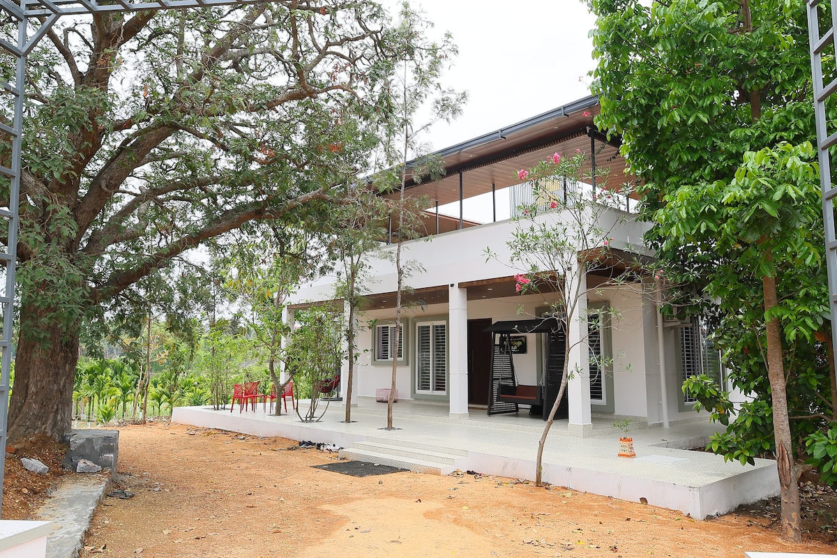 Відпочиньте в цьому чарівному помешканні на вихідних, всього в 50 км від Бангалора. Відпочинок площею 1300 кв. футів з видом на спокійні гори. Вітер під джекфрутовим деревом або в гамаку для спостереження за зірками, і збирайтеся біля чаші для багаття. У помешканні з однією спальнею є затишний куточок для читання, вітальня, повністю обладнана кухня та їдальня. Насолоджуйтеся атмосферою села з постійним вітерцем і залишайтеся на зв 'язку з цілодобовим Wi-Fi. Створіть незабутні спогади в цій сільській гавані серед обіймів природи.