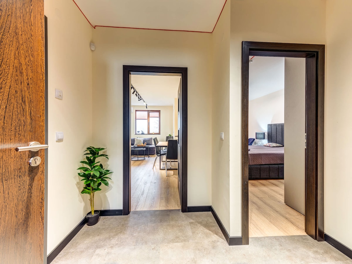 Відчуйте ідеальне поєднання сучасної елегантності та гірського шарму в нашій абсолютно новій розкішній квартирі з однією спальнею в Смоляні. Насолоджуйтеся приголомшливим видом на гори Родопи, не виходячи з стильної вітальні з плюшевим ліжком queen-size, повністю обладнаною кухнею та великим приватним балконом. Цей ретрит із високошвидкісним Wi-Fi, центральним опаленням і безкоштовною парковкою ідеально підходить для пар або одиночних мандрівників. Недалеко від місцевих ресторанів і стежок, це ваш ідеальний гірський відпочинок.