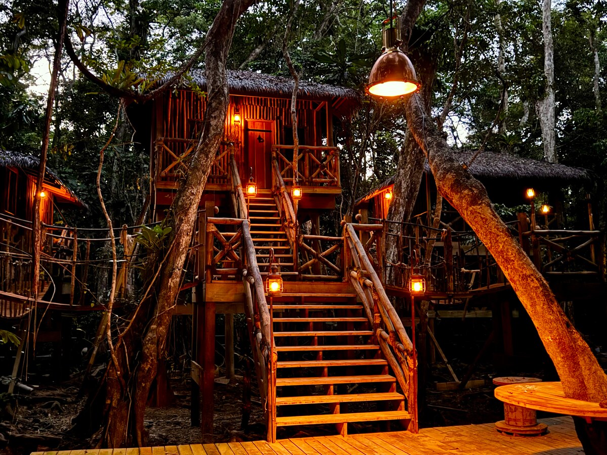 Не виїжджаючи з міста, отримайте унікальні враження, зупиніться в справжньому будинку на дереві, всередині ви знайдете двоспальне ліжко на 2 людини, диван-ліжко, ідеальне для дитини, повноцінну ванну кімнату, кухню, сніданок, балкон, телевізор з Wi-Fi, надувне джакузі та гамаки, у саду є зона для кемпінгу з ванними кімнатами, якщо ви хочете розбити табір з друзями * додаткова ціна з особи. Екскурсія на човні до водоспаду * за додаткову плату. Альтанка з кухнею на відкритому повітрі, газовим грилем, щоб насолодитися їжею на відкритому повітрі та місцем для багаття.