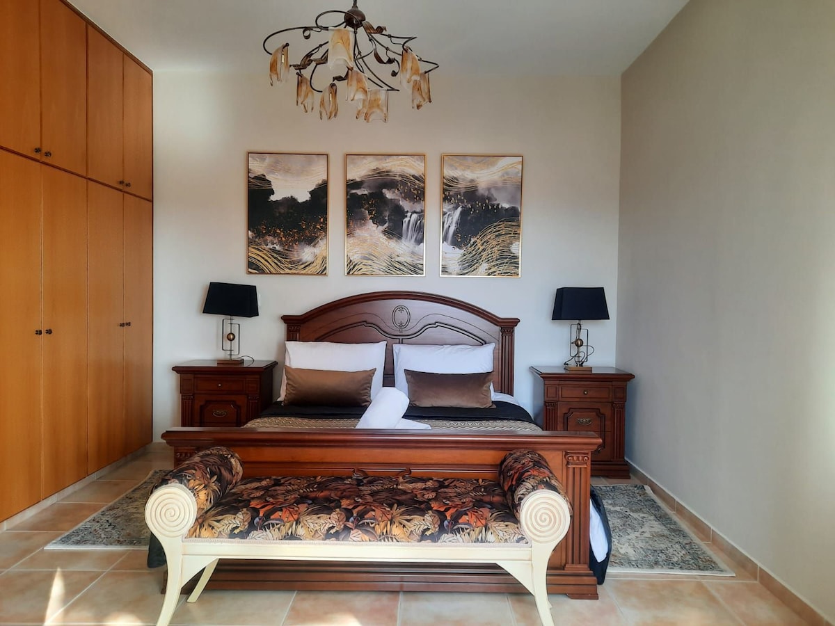 Тихі апартаменти з видом на море та захід сонця, ідеально розташовані в центрі туристичної зони в 5 хвилинах ходьби від піщаного пляжу; найбільшого торгово-розважального центру з великим супермаркетом Kings Mall, археологічним парком; ресторанами та кафе, автобусною зупинкою. Дві спальні, вітальня з двома розкладними диванами, два балкони. Окрема(!) кухня з необхідною технікою та кухонним приладдям. Повністю довга ванна кімната. Базові спальні місця 4 і до 3 додаткових .