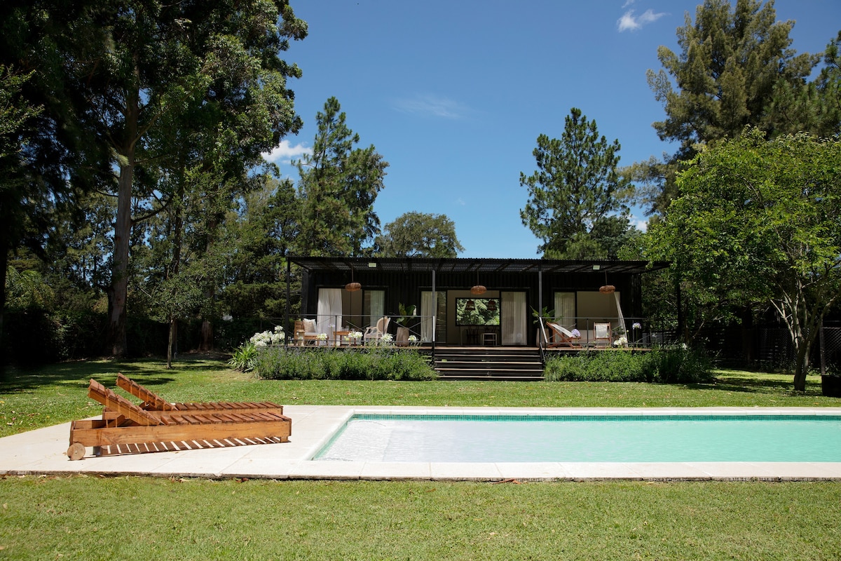 Одноповерховий будинок, яскравий і функціональний, ідеально підходить для відпочинку. Розташоване в ексклюзивному огородженому районі Тесалія, в центрі регіону поло Аргентини, Paraje Ellerstina, всього в 50 хвилинах їзди від Буенос-Айреса. У будинку є приватний сад площею понад 1000 м², органічний овочевий сад, контейнер для компосту, оптоволоконний Wi-Fi, кондиціонер у кожній кімнаті та постільна білизна. Можна перебувати з домашніми тваринами: ми вітаємо собак! Слідкуйте за нами на @casaaguaribay