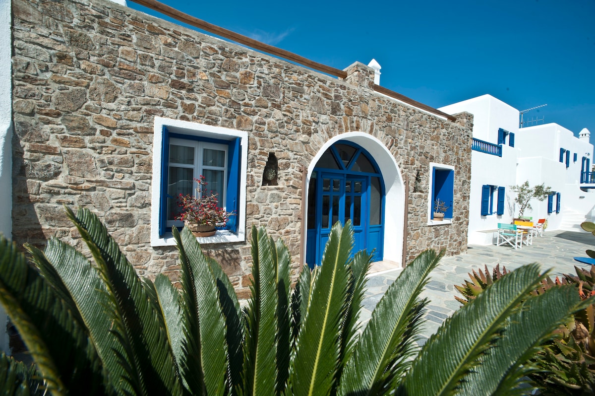 Традиційний міконський стиль у тихому, розкішному комплексі, ідеально підходить для пар і сімей. Розташований в Орносі, в 3 футах ходьби від пляжу Корфос (пляж Кайтсерфер) і в 5 футах ходьби від пляжу Орнос. Тут є великий спільний басейн, повністю обладнана кухня, ванна кімната, спальня відкритої плани та вітальня (2 великих дивана – 3 людини). Існує передня веранда з дерев 'яною перголою, яка пропонує унікальний відпочинок у басейні та високошвидкісний Wi-Fi зі швидкістю 50 Мбіт/с.