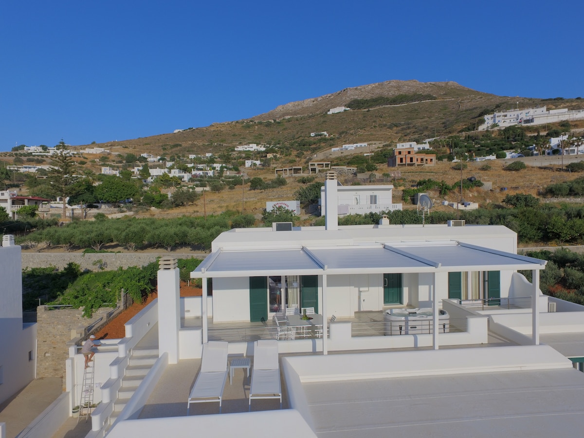 Sueno sunset villa for 2 is located in a nice area which combines beautiful sea-views,it is part of a complex consisting of 5 other apartments,It is 2,3 kilometers from the port of Parikia .The old town, the shops and the night life are 1200 meters away. It is 33 square meters and has a fully equipped kitchen, 1 bedroom, a living room, 1bathroom and veranda with jacuzzi is not heated. You deliver it clean with sheets and towels and there is not a service include during your stay.