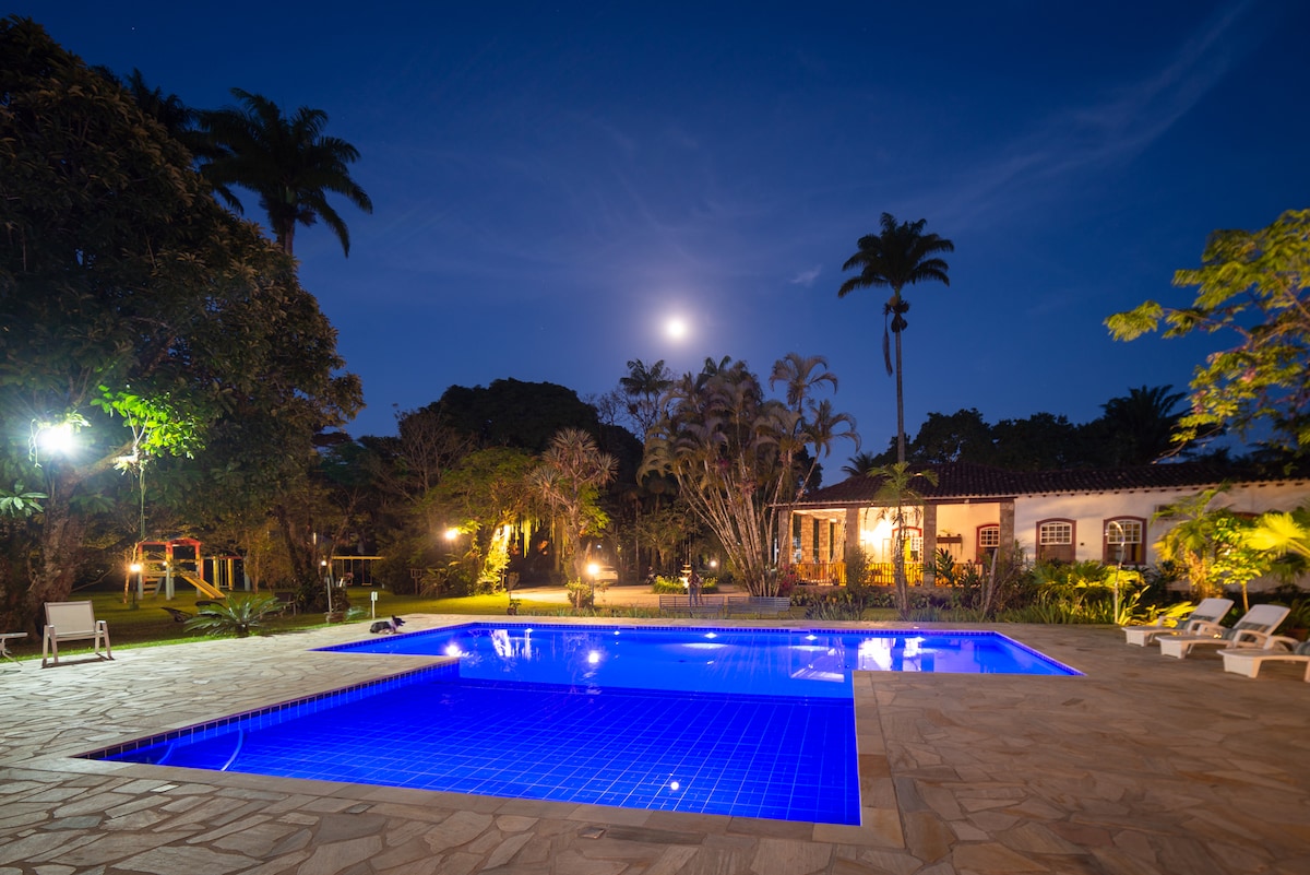 Цей абсолютно новий будинок розташований високо над деревами в екологічному селищі Aldeia Rizoma, закритому помешканні в 15 хвилинах ходьби від історичного центру міста. У помешканні є тренажерний зал у джунглях, сауна (за додаткову плату), приватні стежки та доступ до 5 приватних водоспадів. Студія з однією спальнею має ліжко розміру «king size», побудоване високо, щоб ви могли спостерігати за відпочинком від нього. До послуг гостей приватна гідромасажна ванна та повністю обладнана кухня. Є додаткове ліжко, яке можна використовувати для третьої особи за додаткову плату за ніч