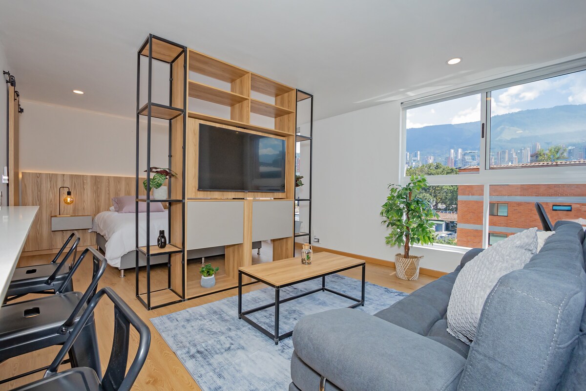 High-tech luxury in Poblado. Brand new loft steps from Parque Poblado & Calle 10. Short walk to Provenza. 🚀 Work: 800Mbps Fiber (verified) & pro desk. 💎 Premium: OLED TV, AC, King bed & Blackout curtains. 🏙️ Views: Stunning city skyline from your window. 📍 Location: The safest, most walkable area. Walk to top dining & cafes. Features soundproof windows perfect rest in the heart of the action. Work & Play in style!