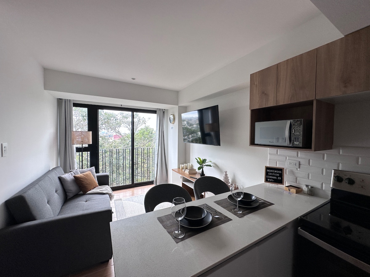 ★НЕМАЄ СЕРВІСНОГО ЗБОРУ AIRBNB!!★ Ексклюзивна перевага для ГОСТЕЙ CARAVANA ★КВАРТИРА★ GUATENCANTO CITY У МОДНІЙ ЗОНІ 4 Відчуйте враження від перебування в міській квартирі Гуатенканто з бохо-деко в будівлі в індустріальному стилі, розташованій у новій модній зоні міста Гватемала. Ви матимете можливість зупинитися біля вулиць для прогулянок і безлічі модних ресторанів і кафе. У квартирі Guatencanto є спільні зручності, які є справді привілеєм для використання, як-от тренажерний зал і красива палуба.