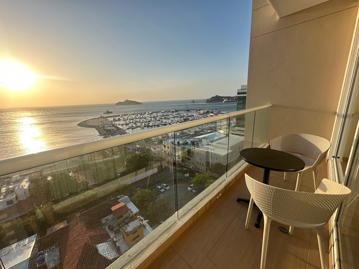 Espectacular apartamento en planta 6 con vista al mar. Sus 73 mts cuadrados están decorados en un estilo moderno y acogedor. Situado delante de la Marina Internacional y a 3 minutos caminando del parque de los novios. Cuenta con 2 balcones para disfrutar del los increíbles atardeceres de Santa Marta, nuestros huéspedes tienen acceso a las lujosas instalaciones del hotel Marriot, sus dos piscinas con vistas al mar, restaurante, Bar y servicio de masajes. cuenta con dos ascensores