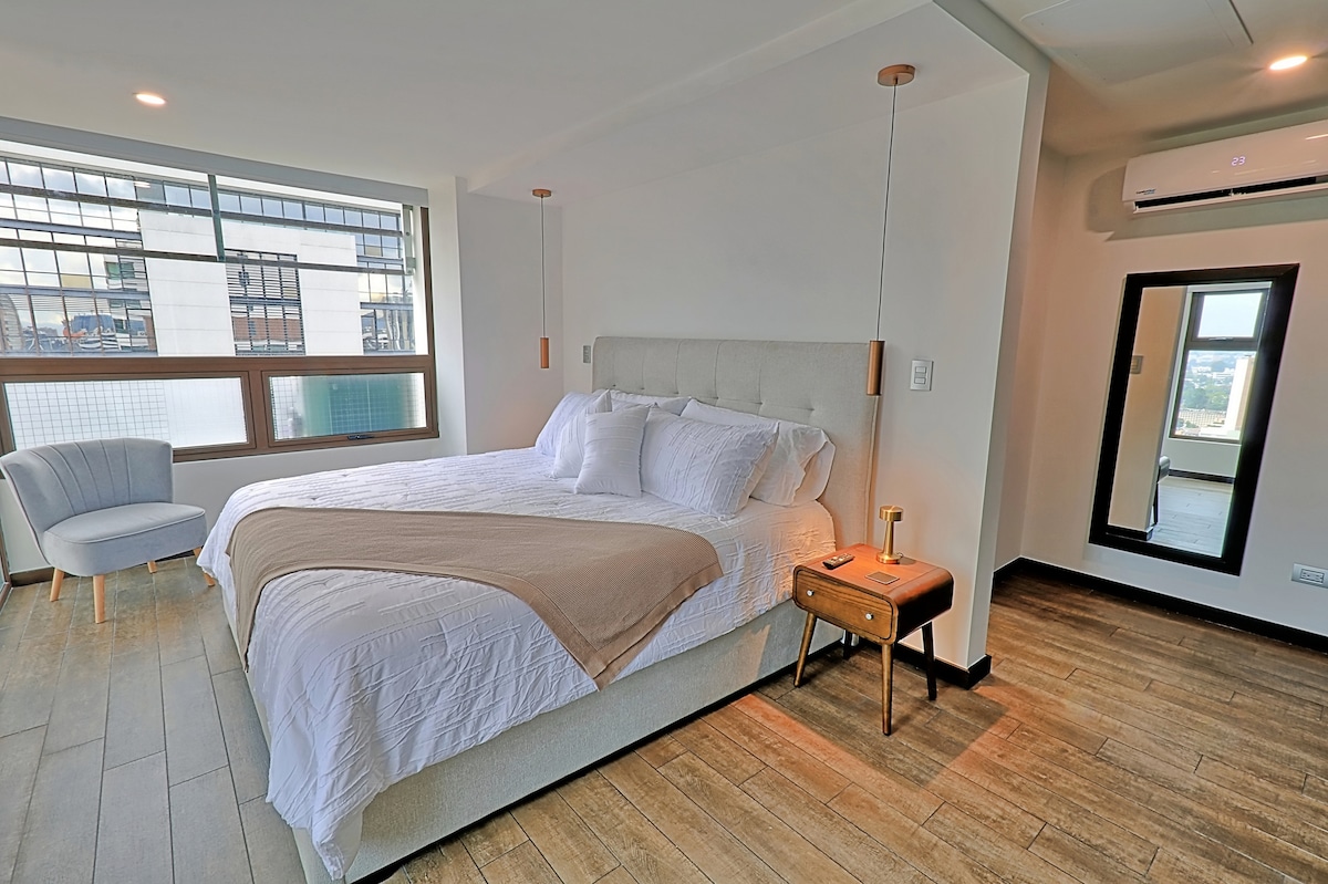 🏙️ Відчуйте Гватемалу з 23-го поверху в сучасній квартирі з приватним балконом і приголомшливим видом на місто. Ідеально підходить для пар або індивідуальних мандрівників, які шукають стиль і розташування. 📍Розташований у центрі Зони 10, всього в декількох хвилинах від аеропорту та в декількох кроках від торгового центру Oakland Mall, оточений ресторанами та нічним життям. 🛋️ Повністю обладнана кухня, швидкий Wi-Fi, Smart TV. 🏢 Басейн, тренажерний зал, конференц-зал та цілодобова охорона. 🛬 Ідеально підходить для туризму або відряджень.