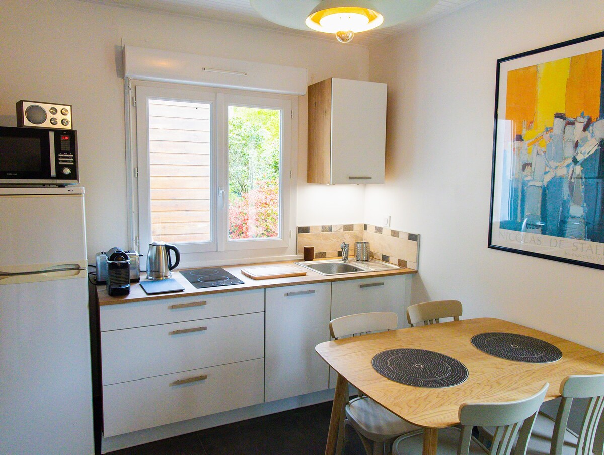 Затишний, тихий котедж з 1 спальнею. Квартира з однією спальнею (T1 bis). Повністю обладнана квартира в стилі ательє з відкритими балками. На першому поверсі невеликого окремого будинку (внизу не здається в оренду) ви будете насолоджуватися його дерев 'яною терасою, не забуваною про південь/захід. Ідеально підходить для відпочинку або ділових поїздок, на вихідні, кілька днів або тижнів... Розташований у центрі Бретея та на півдорозі між столицею Бретона (20 км) та міфічним лісом Броселіанд (24 км). Доступ до поїзда за 8 хвилин пішки