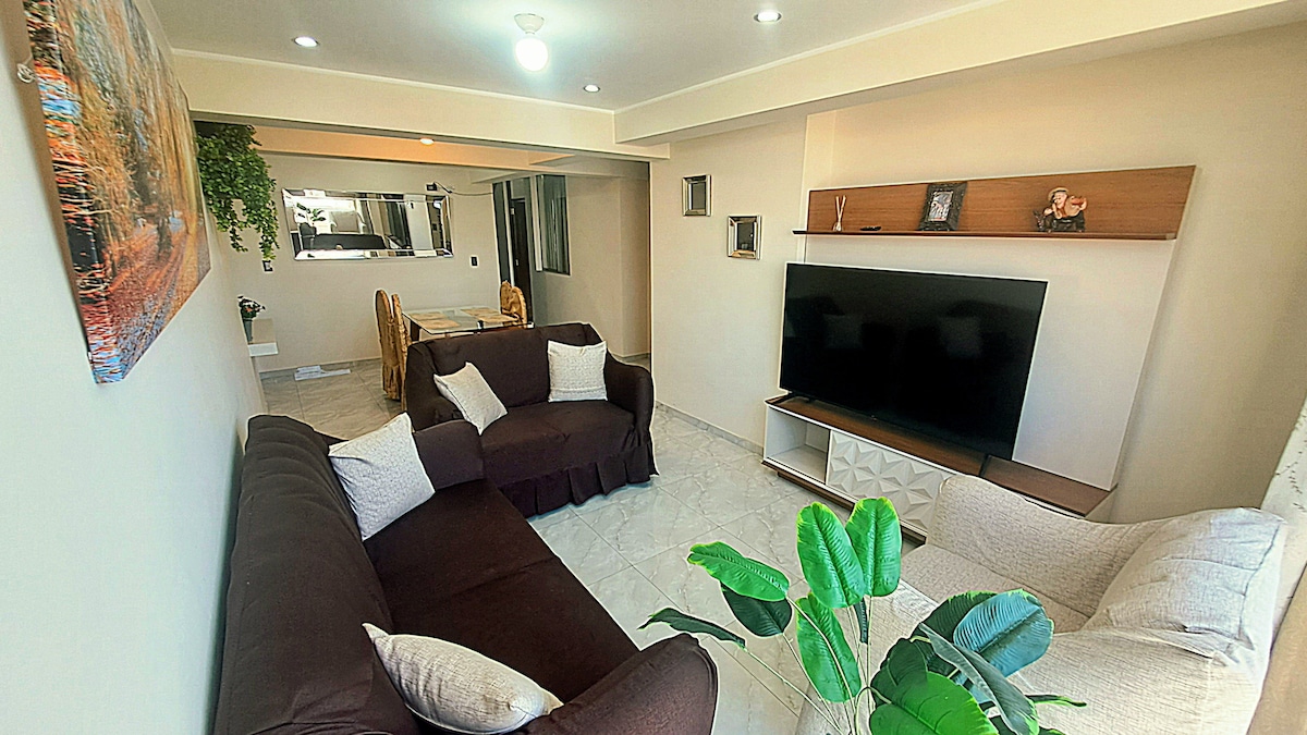 Consta de una sala con TV de 65” NETFLIX para su total distracción, además tiene un equipo de sonido para su comodidad. Un comedor, una cocina equipada con artefactos y menajeria completa para su estadía. Tiene tres dormitorios c/u cama 2 plazas, televisores Smart en c/u y mesas con sillas, con ropero empotrado uno de ellos tiene un baño privado y los otros 2 con baño compartido. Cuenta con cochera. Tiene agua caliente todo el día y una buena señal de WIFI. Cuenta con acabados de primera.