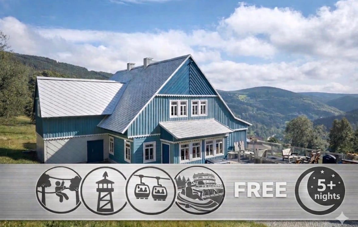 Наша хата пропонує розкішне розміщення як для вимогливих клієнтів, так і для сімей із дітьми. Вона розташована в тихому місці в оточенні зелені в Крконошах, за 1 км від Високого над Їзерою, де є гірськолижний курорт Шахти. Поруч можна покататися на лижах у Яблонці-над-Йизерою, Пасеках-над-Йизерою.