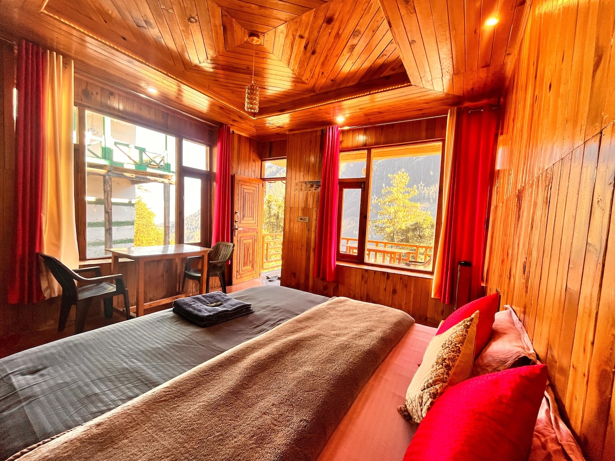 "Welcome to our cozy log cabin nestled in the heart of the enchanting Jibhi, Himachal Pradesh, where every morning, you'll wake up to breathtaking views of the majestic Jalori Pass. Our log cabin-style property provides a warm and rustic ambiance that's perfectly complemented by modern amenities for your comfort. The bedroom offers an incredible view of Jalori Pass, making each morning a magical moment as you open your eyes to nature's grandeur,