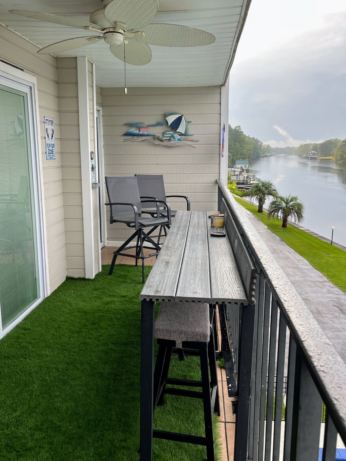 Це красива квартира з двома спальнями, двома ванними кімнатами. Він знаходиться на першому поверсі, має приголомшливий вид на внутрішньоприбережний водний шлях. Вийдіть за задні двері екранованої веранди та зробіть кілька кроків до освітленої пішохідної доріжки, оглядового причалу та човна/рибальського причалу. Він розташований у закритій громаді з цілодобовою охороною. Цей кондомініум знаходиться в декількох хвилинах ходьби від Бродвею на пляжі, аеропорту, шосе 31 з швидким доступом до північних і південних пасм, продуктових магазинів і пляжів.