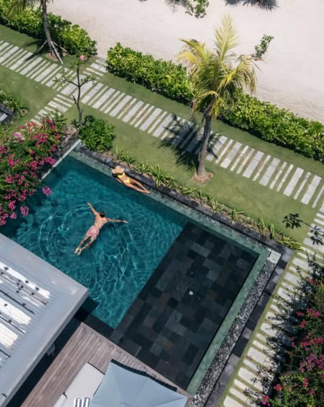 Ця чудова сучасна 2-поверхова вілла знаходиться всього в 10 м від незайманого білого пляжу і має 3 спальні з двоспальними ліжками, кожна з яких має сейфи в номері, ванні кімнати з прісноводним душем та супутниковим телебаченням. Внизу розташована простора вітальня та їдальня, що веде на широку терасу з шезлонгами та басейном з прісною водою 10 х 3 метрів. 2 традиційні дерев 'яні вітальні Bale' s забезпечують простір для прохолодного відображення.