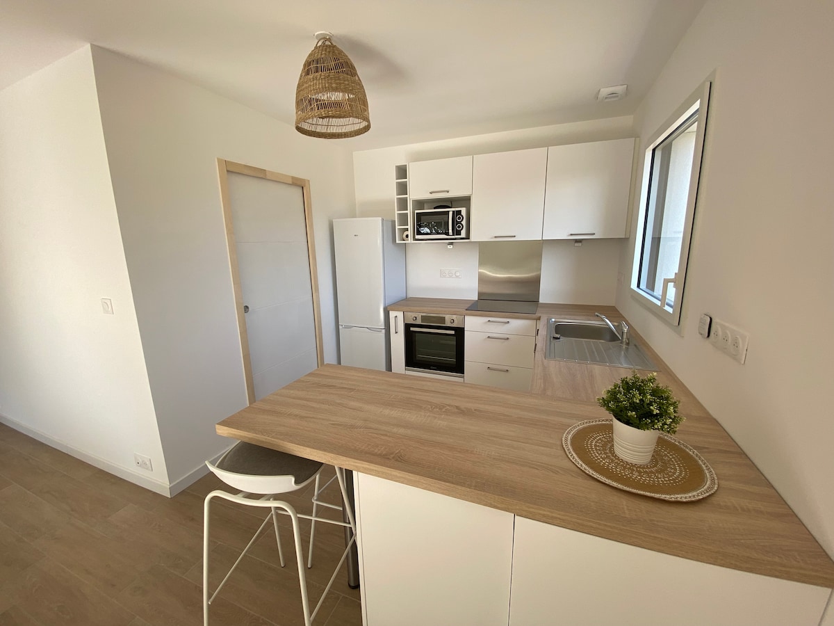 150 м від GR34, приємний маленький будиночок, побудований у 2021 році, з позначкою 3* мебльований туризм, з усіма зручностями для гарного перебування в Порт-Блані. Ви можете спокійно відпочити від вулиці і водночас близько до моря, яке можна почути під ритм припливів.