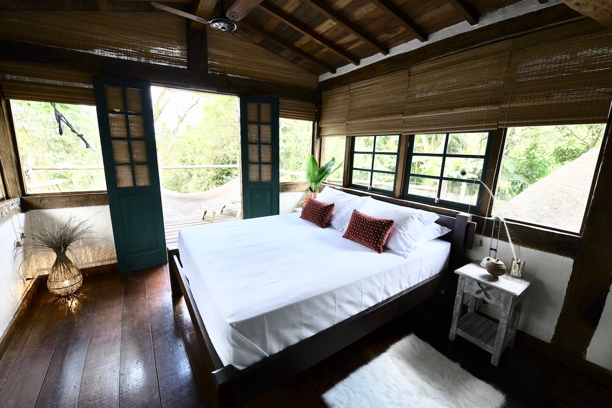 Casa completa em terreno paradisíaco de 7.000m² com outras 9 casas para casal independentes e privativas. A Casa Rio possui quarto amplo, cozinha, banheiro com chuveiro a gás, e varanda espaçosa com mesa para trabalho de frente para piscina natural e queda d'água, que harmoniza o ambiente com o som das águas dia e noite! Além de oferecer cozinha completíssima com todos os equipamentos necessários a casa conta ar condicionado, Smart TV, internet wifi, chuveiro a gás e secador de cabelo.