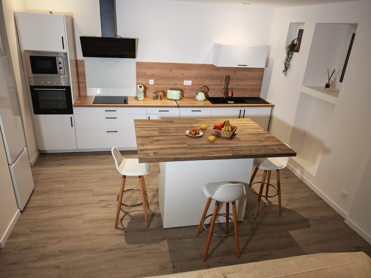 Квартира F2 (54 кв. м), розташована на першому поверсі окремого будинку, в житловому районі поблизу всіх зручностей. Ідеально підходить для 2 осіб з можливістю розміщення 2 інших (диван-ліжко з постільною білизною) за додаткові 40 євро за ніч. Якщо вам 4 роки, забронюйте на 3 години, щоб не платити 80 євро, які на сайті запитує вас замість 40 євро.